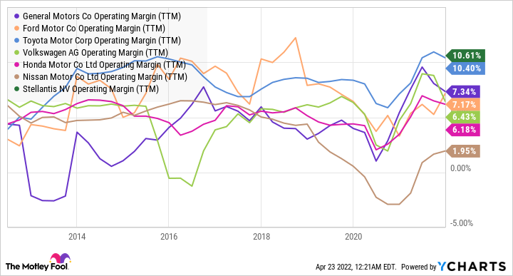 The auto industry is highly competitive and cyclical, and operating margins as high as the 19% that Tesla posted in Q1 are rare. Below are the operating margins of some top automakers over the last decade.