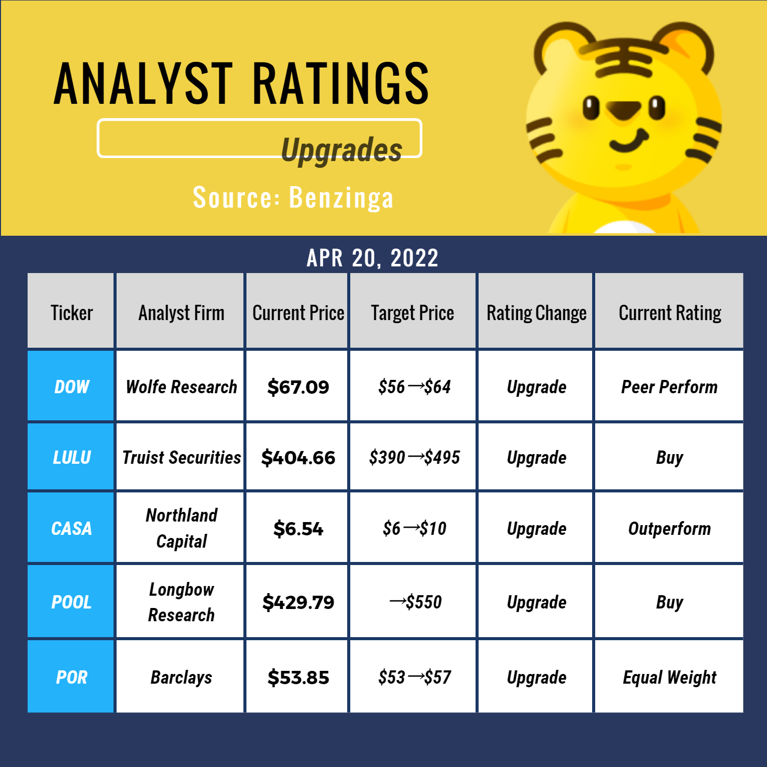 Top 5 Upgrades are: $Dow Chemical(DOW)$ $Lululemon Athletica(LULU)$ $Casa Systems(CASA)$ $Pool(POOL)$ $Portland General(POR)$