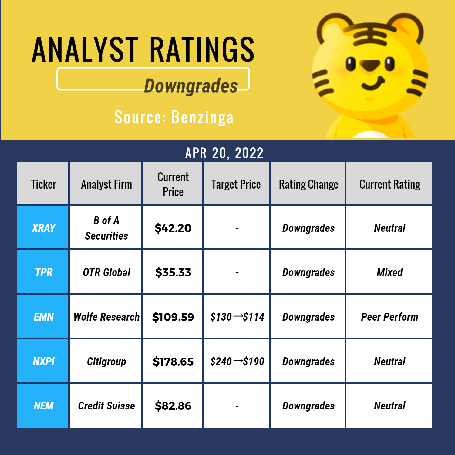Top 5 Downgrades are: $Dentsply Sirona(XRAY)$ $Tapestry Inc.(TPR)$ $Eastman Chemical(EMN)$ $NXP Semiconductors NV(NXPI)$ $Newmont Mining(NEM)$