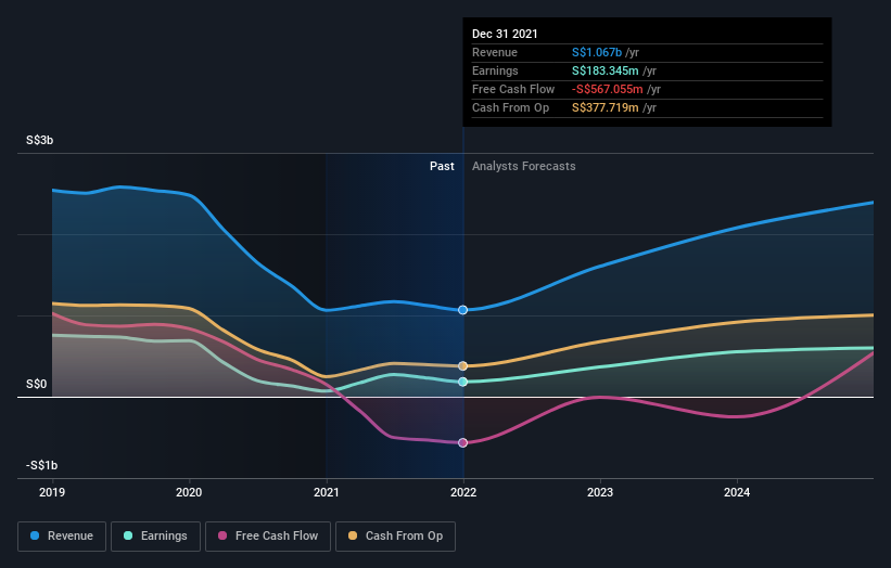 Genting Singapore already has institutions on the share registry. Indeed, they own a respectable stake in the company. This can indicate that the company has a certain degree of credibility in the investment community. However, it is best to be wary of relying on the supposed validation that comes with institutional investors. They too, get it wrong sometimes. It is not uncommon to see a big share price drop if two large institutional investors try to sell out of a stock at the same time. So it is worth checking the past earnings trajectory of Genting Singapore, (below). Of course, keep in mind that there are other factors to consider, too.