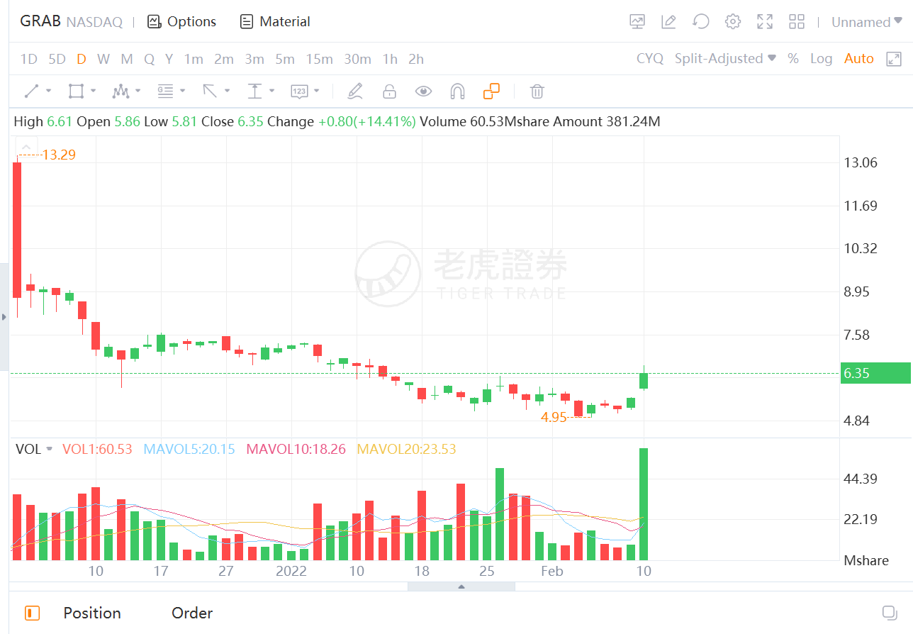 $Grab Holdings(GRAB)$ price action on Daily 14 Feb close up $5.91 is nearing 50SMA $6.61. Would put in some starter positions if it could clear that and add more when it cleared 100SMA around $9.30 [保佑]