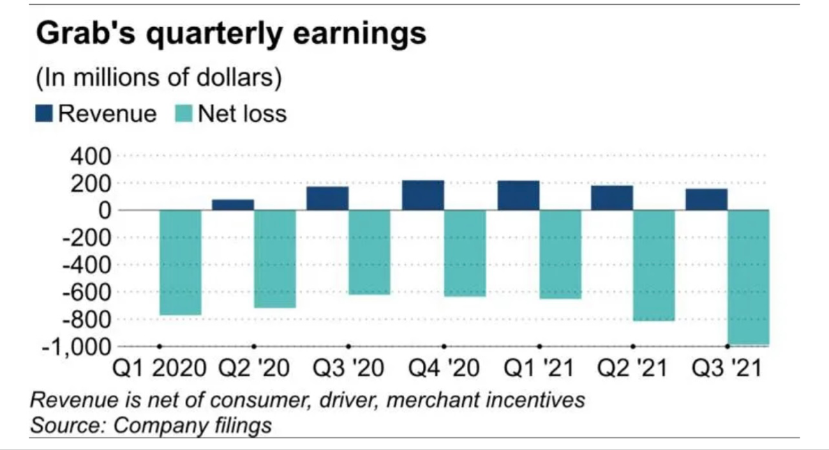 Can Grab turn in a profit currently? It is actually bleeding cash. Losses in Q3 2021 grew to 988 million dollars. Its core business that is ride hailing and food deliveries profit margin is low as it faces competition from other operators like GoJek and Food Panda.