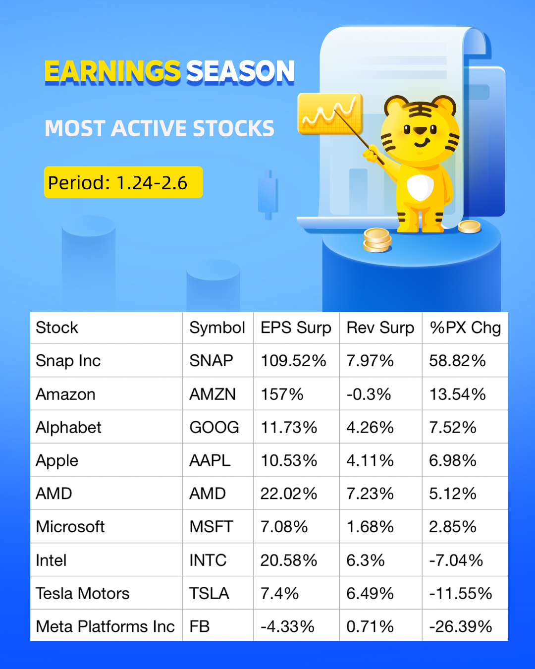 Earnings season turned chaotic last week, with several tech reports spurring wild stock swings. $Amazon.com(AMZN)$ shares added 13.5% on Friday, $Snap Inc(SNAP)$ surged 58.8%, while$Meta Platforms, Inc.(FB)$ dropped 26% on Thursday .