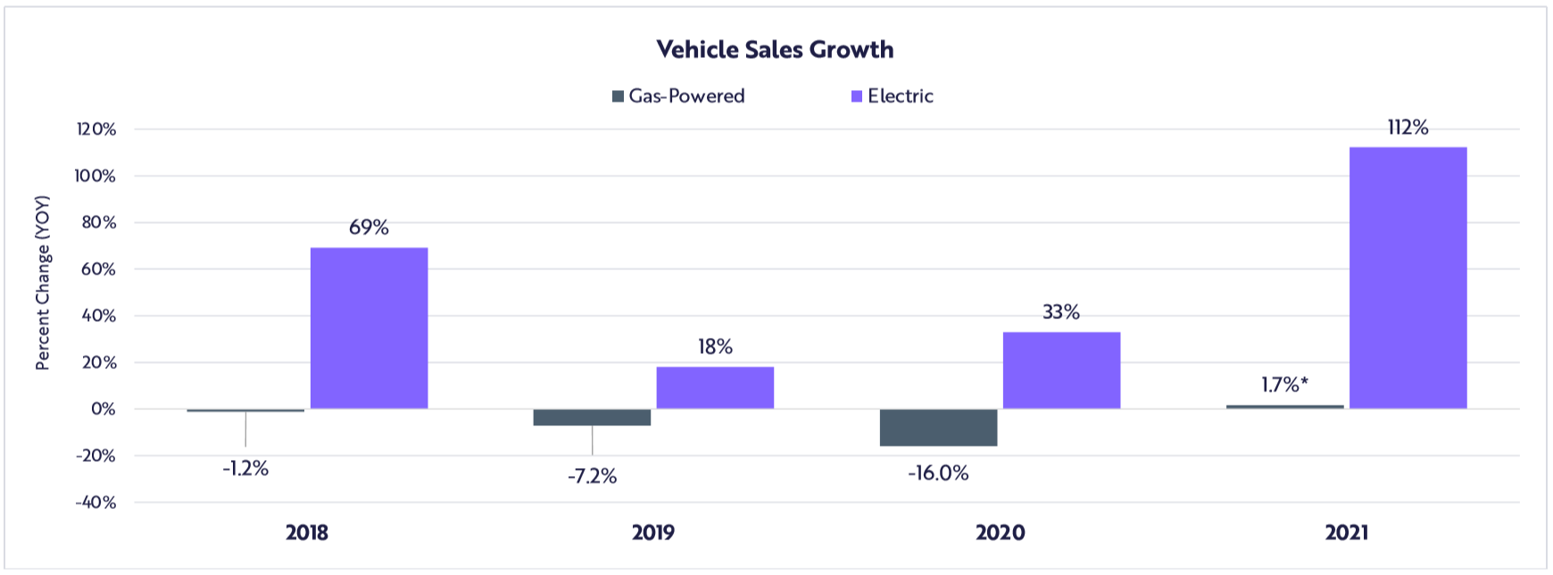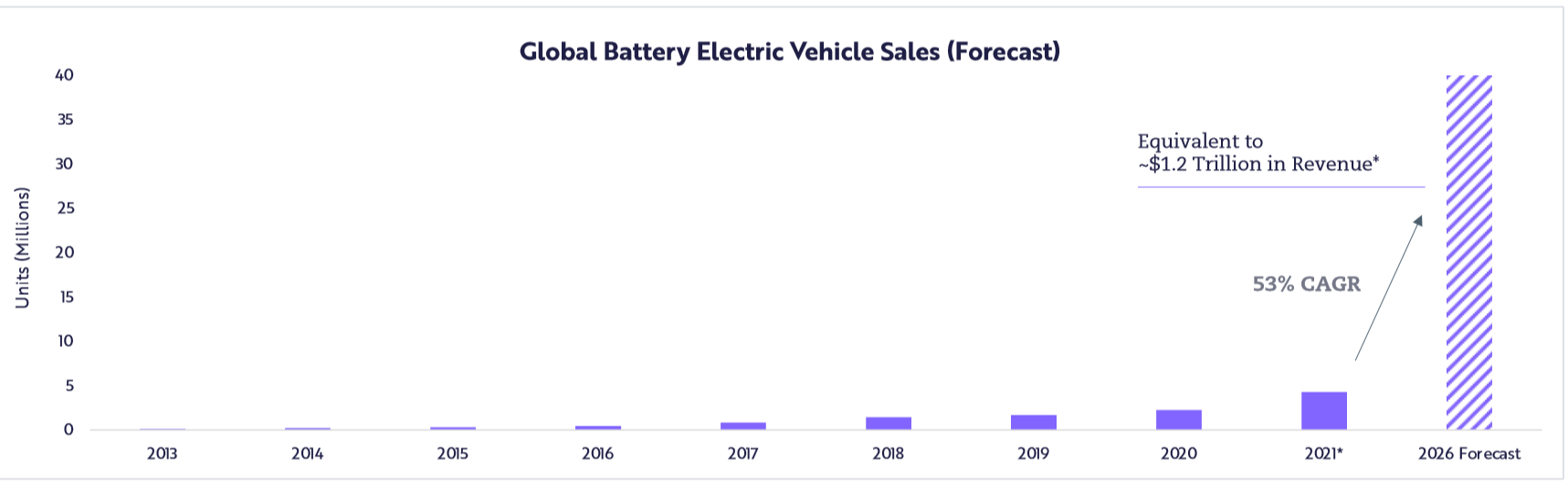 Regarding the Future of EVs sales, The ARK's BIG IDEAS 2022 Annual Report pointed out that EV sales soared and continued to gain share globally. In contrast, growth in global EV unit sales accelerated from 60% in 2013 to an estimated 112% in 2021.Ark also forecasts that EV sales will increase at a 53% annual rate, to 40 million units in 2026.