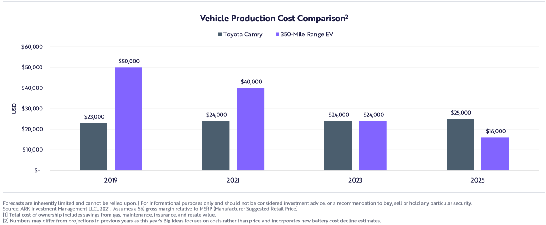 Besides that, ARK forecasts that Electric Vehicle Costs Could Rival Gas-Powered Options In 2023. Because the battery cell costs will fall by 28%, EV production costs and sticker prices are likely to drop below those of gas-powered vehicles in the next one to two years and undercut them by 25-35% in 2025.What's More, ARK believes Wright’s Law also models improvements in EV charging rates, the ability to charge an EV quickly is impacted by both the vehicle and the charging infrastructure. Once EV charging rates reach an acceptable level, ARK expects the industry will optimize for other features like autonomous driving, safety, and possibly entertainment.