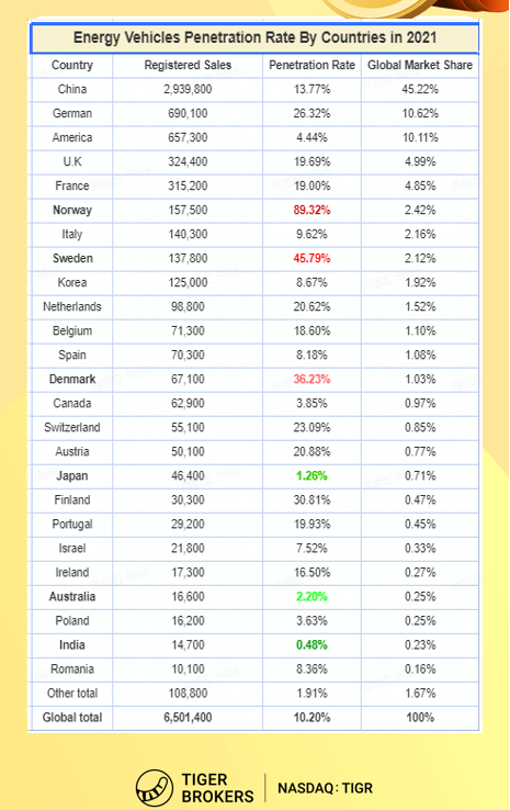 It's not hard to see that the third-best-selling, but low penetration market, America, still hasn't really adopted EVs. This suggests that Americans still love "powerful" pickup trucks. While The lowest penetration rate was in India, Japan, and Australia. The main reasons may be that Japan has not been enthusiastic about pure electrification, Australia is sparsely populated, and India, the fifth-largest auto market in the world, has just begun to apply the government's incentive plan for EVs.