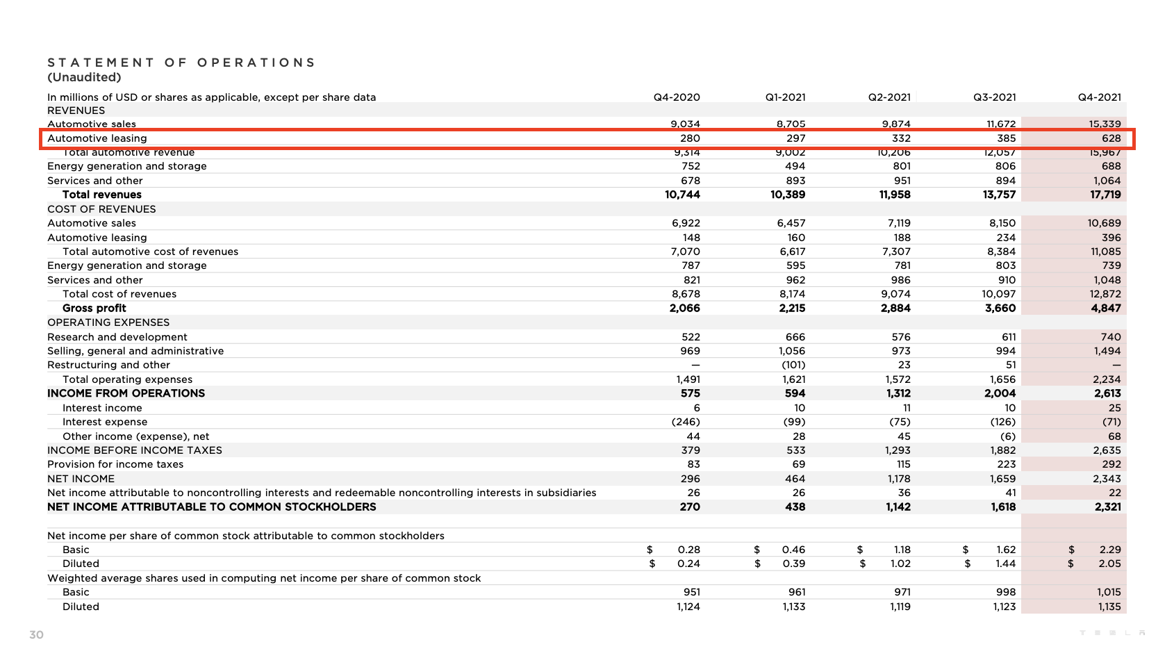 According to the plan, after consumers sign a contract with "0-down payment", 1-5 years belong to the lease period. Auto finance leasing is an auto finance business that is different from auto mortgage loans, and the main purpose is to purchase cars in installments. In the automobile financial leasing business, the ownership of the vehicle belongs to the financial leasing company during the lease period, and the lessee has the right to use the vehicle. Compared with one-time car purchases and auto loan, it is easy way to attract more clients.Net income, at $2.32 billion, was up some 760%, and Tesla said it had a 27.4% gross margin, compared with 26.6% in the previous quarter. Tesla Inc. set a record for profit but warned that supply chain problems will keep it from introducing new vehicle models this year while it focuses on expanding production of its current lineup.