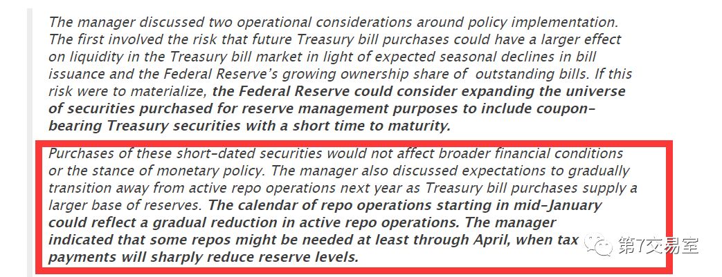 但在這次的貨幣政策紀要中,美聯儲並沒有提及要續作此前的repo市場流動性注入,反而強調說對回購市場的干預應根據年末市場狀況進行調整,同時還提及,股票市場和回購市場的出色表現提振了美聯儲的信心,這似乎意味着他們認爲自己已經重新控制了回購市場,像12月初那樣,進行大的回購市場注入計劃就不大可能了。