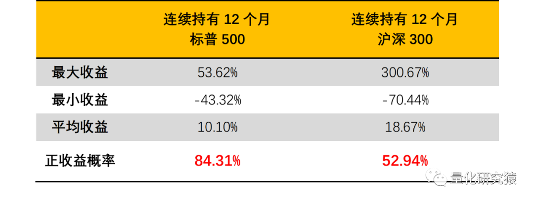 上圖反映了在時間序列上,連續持有12個月的標普500或滬深300的總收益。 很明顯的可以看出,大A股(黃色)“上蹦下躥”的特性一覽無餘,相比之下,美股(藍色)則要平滑的多得多。 或許圖像大家有所不適應,下面的數據會更加的直觀。