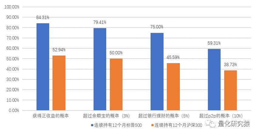 - 隨機時點進入股市,無論持有期是1個月,3個月,6個月還是12個月,美國標普500的賺錢的概率均大於A股滬深300;