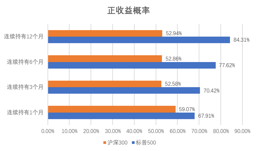 - 隨着持有期的增加,投資美國標普500獲得正收益的概率顯著增加,從1個月的67.91%,到12個月的84.31%;