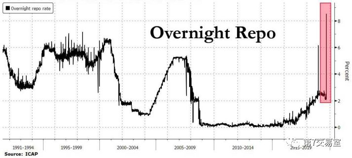 美國的普通抵押品隔夜回購利率已經出現了創紀錄式的跳升,從2%一躍超過8%。這個利率通常用在銀行間短期拆借市場,用來做資金週轉的緊急用途。