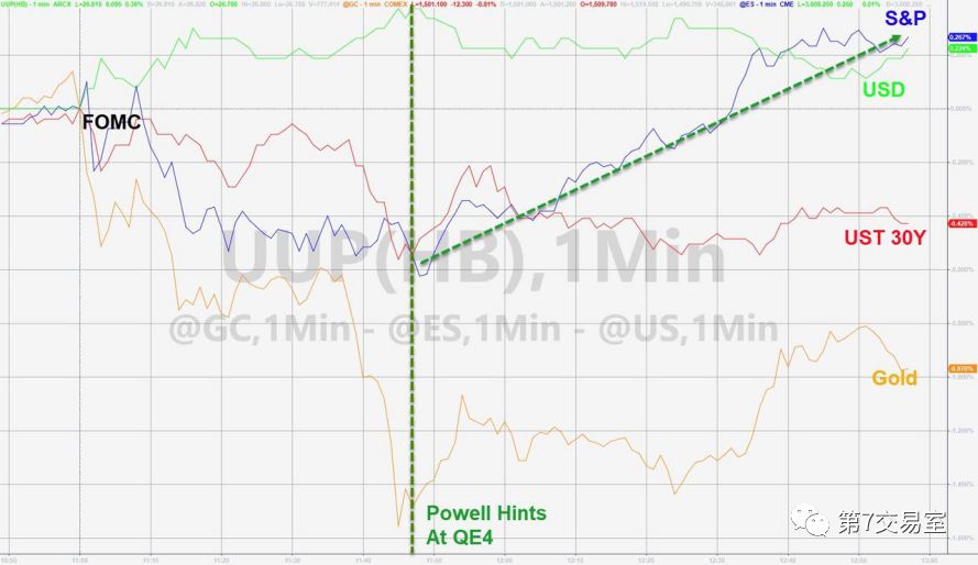 但在鮑威爾的這句話出現之後,黃金,美債市場,和美元指數幾乎同時都出現了反轉: