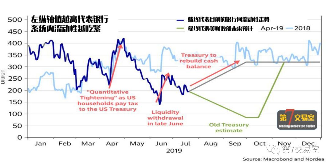 因爲前期不斷的縮表導致銀行體系超額準備金下降,隔夜回購市場已經開始飛漲,未來又遇上資金的週期性回籠,流動性吃緊或許將更爲嚴重。這已經不是簡單降息並下調IOER就能短時間解決的問題了。