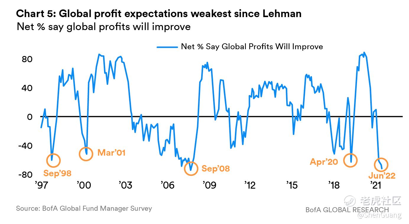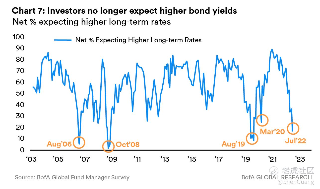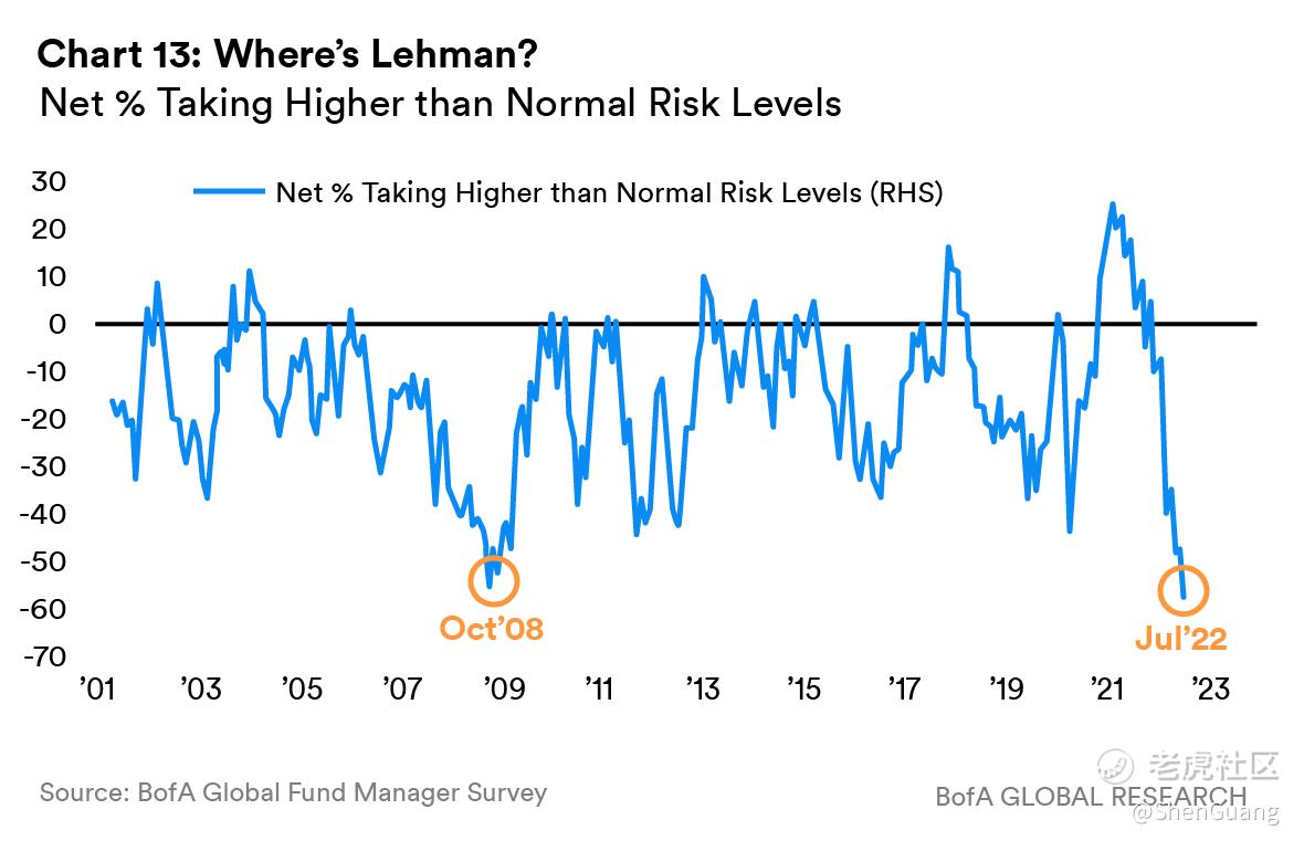 There's an interesting trend in the panelists' perception of risk. While most panelists disagree that they're taking higher than normal risks, BofA points out that fewer panelists had disagreed at a time when Lehman Brothers - a prestigious and historic investment management firm - had gone under in 2008. Given the expectation of a recession, the high cash levels and low expectations on long-term bond yields, the underlying message is that this perception might be flawed.