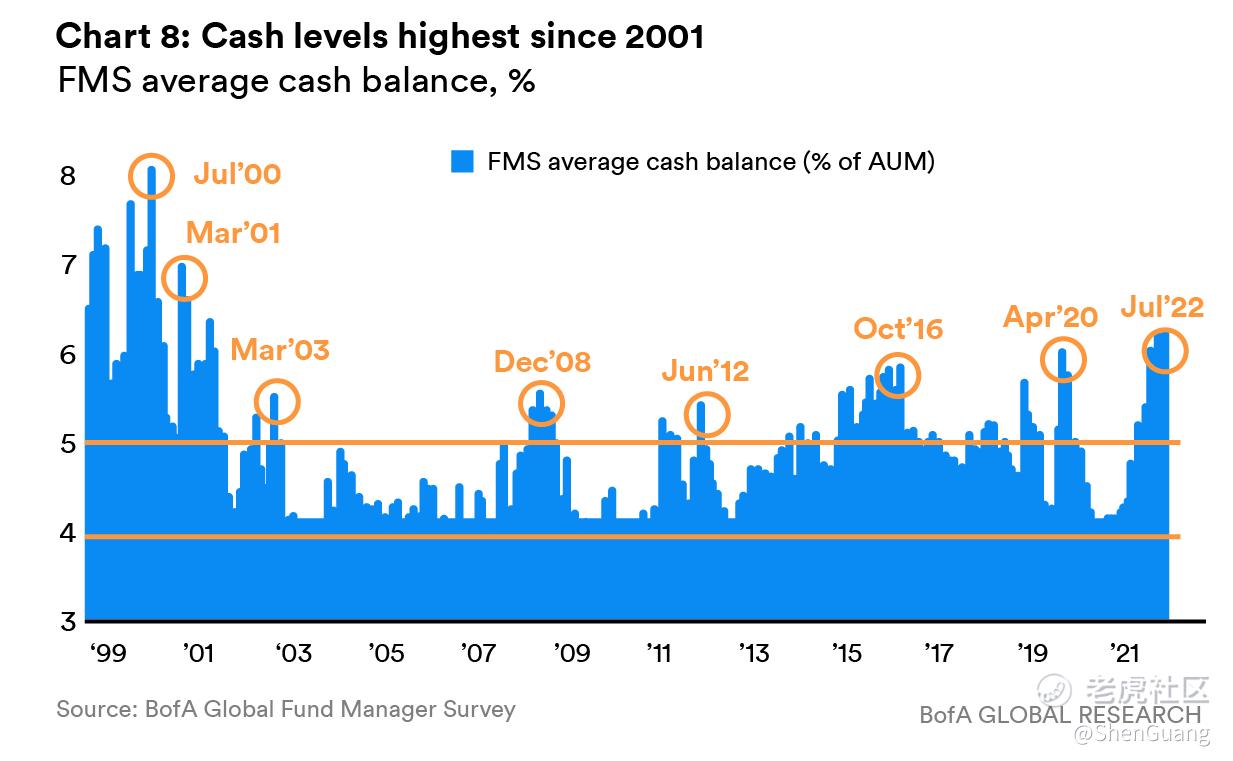 In an interesting development, cash levels held by FMS panelists have, on average, been the highest since 2001. "Cash", in this case, refers to equities held by institutional investors for quick conversion to cash via sales as opposed to mid- to long-term holdings. The tax liability is potentially higher in "cash" but lower in long-term holdings.