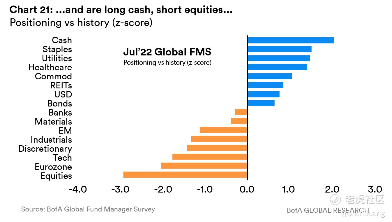 In terms of positioning, these perceptions are negated by the overall change in market focus: the panelists are short global equities, eurozone and tech stocks while they're substantially long on cash and consumer staples.