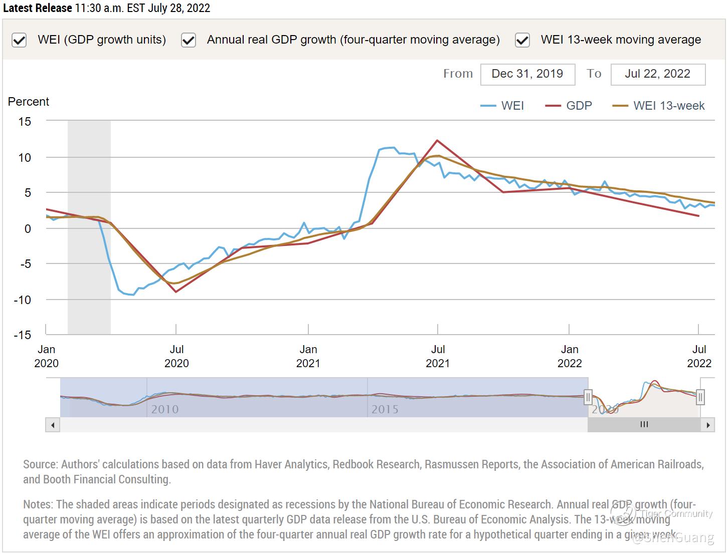 The Federal Reserve System's US Weekly Economic Index (WEI) confirms a long trend in the GDP continuing to slip in line with the WEI: