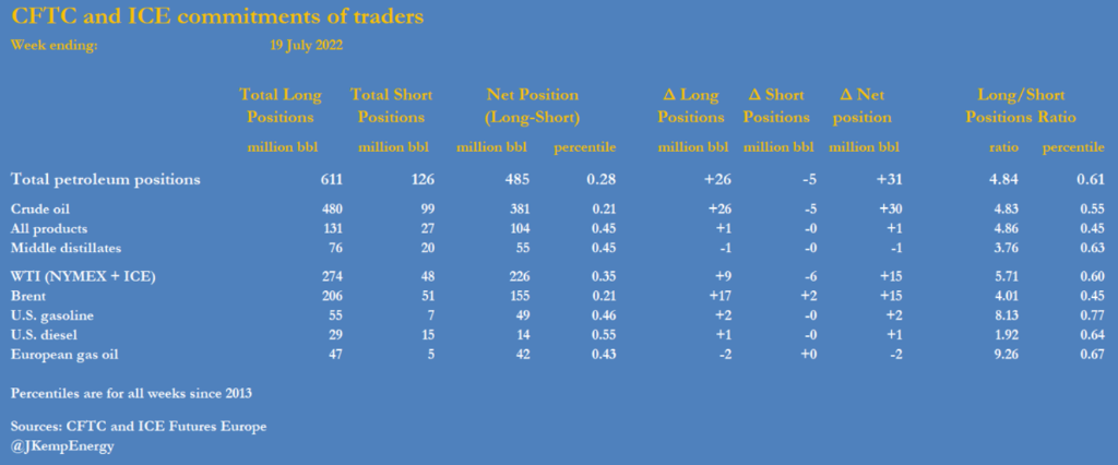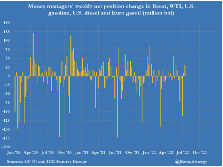 Hedge funds and other fund managers bought a net equivalent of 31 million barrels of crude in the six most important oil futures and options contracts in the week ended July 19. Buying was mostly on new long positions, about 26 million barrels of crude, rather than covering existing short positions, about 5 million barrels.
