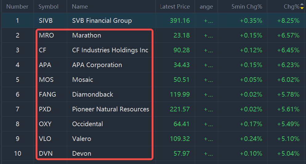 $Marathon(MRO)$ ,$CF Industries Holdings Inc(CF)$ ,$APA Corporation(APA)$ ,$Mosaic(MOS)$ ,$Diamondback(FANG)$ ,$Pioneer Natural Resources(PXD)$ ,$Occidental(OXY)$ ,$Valero(VLO)$ ,$Devon(DVN)$ .Regarding Energy area stocks, they have been performed the best since last winter till June compare to other secotors, under the background of inflation concerns and war worried between Russia and Ukraine.