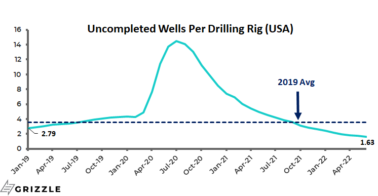 3. Drilled but uncompleted wells (DUCs) are way below normal. DUCs per active rig are 40% below normal.