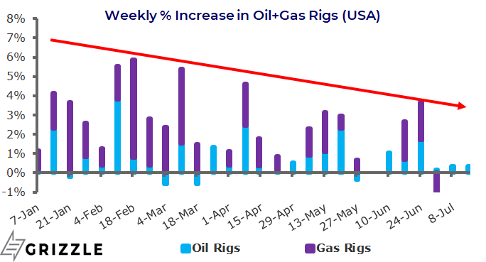 The increase in US rigs has basically stalled in July showing producers are still worried about the economy and not in a hurry to ramp up production.