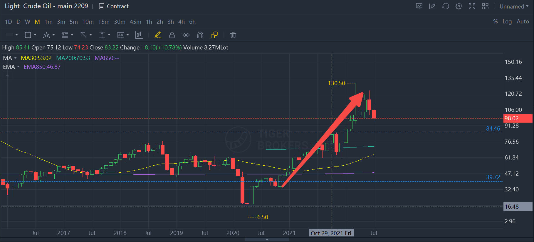 In this period, oil futures $Light Crude Oil - main 2208(CLmain)$ increased from $35 per barrel in Nov 2021 to above $130 per barrel in Jun 2022.