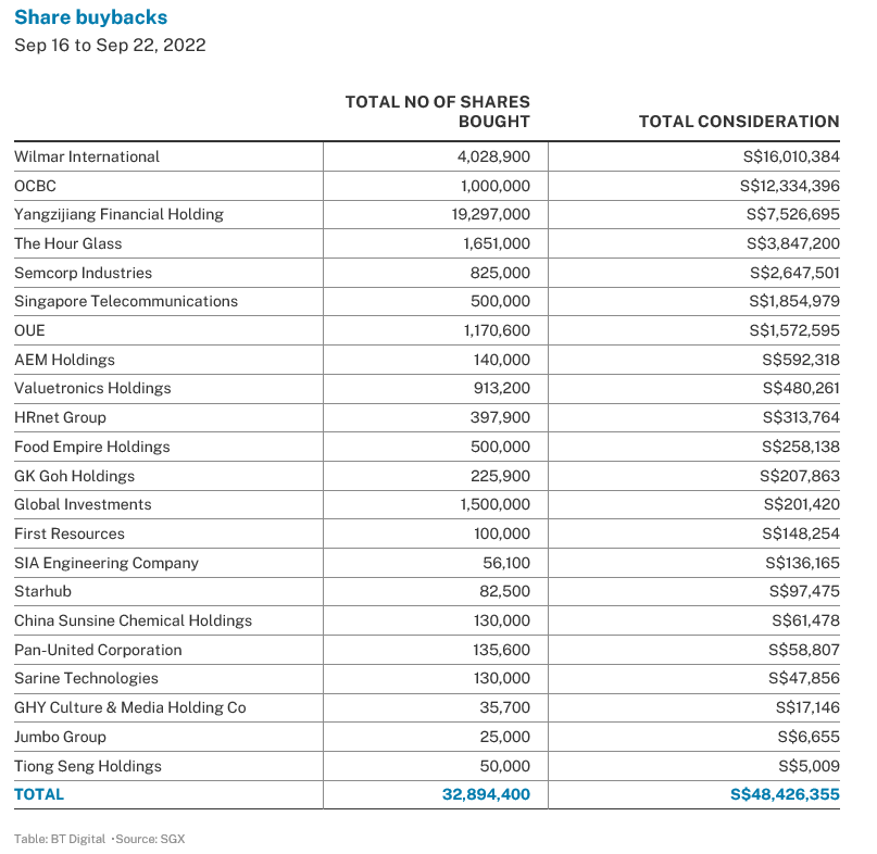 There were 22 primary-listed stocks conducting share buybacks over the 5 sessions ending Sep 22, with a total consideration of S$48 million, up from the preceding week’s S$38 million. $WILMAR INTERNATIONAL LIMITED(F34.SI)$ led the 5-session buyback consideration tally, buying back 4.03 million shares at an average price of S$3.97 per share. Wilmar International has bought back 0.97% of its issued shares (excluding treasury shares) on the current mandate, as of Sep 22.