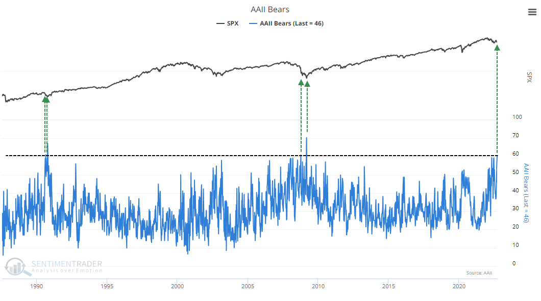 Most bearish reading since 2009. According to SentimenTrader“This week joins just 4 others in 35 years with more than 60% of respondents being despondent in the AAII survey. One year returns after the others: +22.4%, +31.5%, +7.4%, +56.9%”.