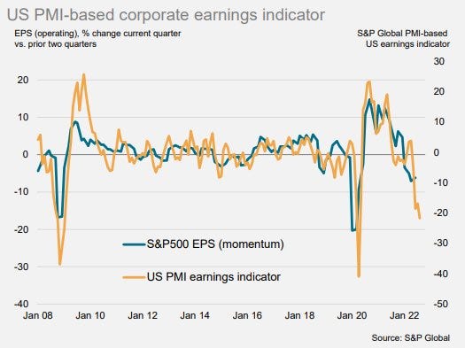Judging by the S&P Global PMI indicators, an earnings recession is on its way. Seems like just about every week we see a new chart with a new indicator pointing to recession/earnings collapse!
