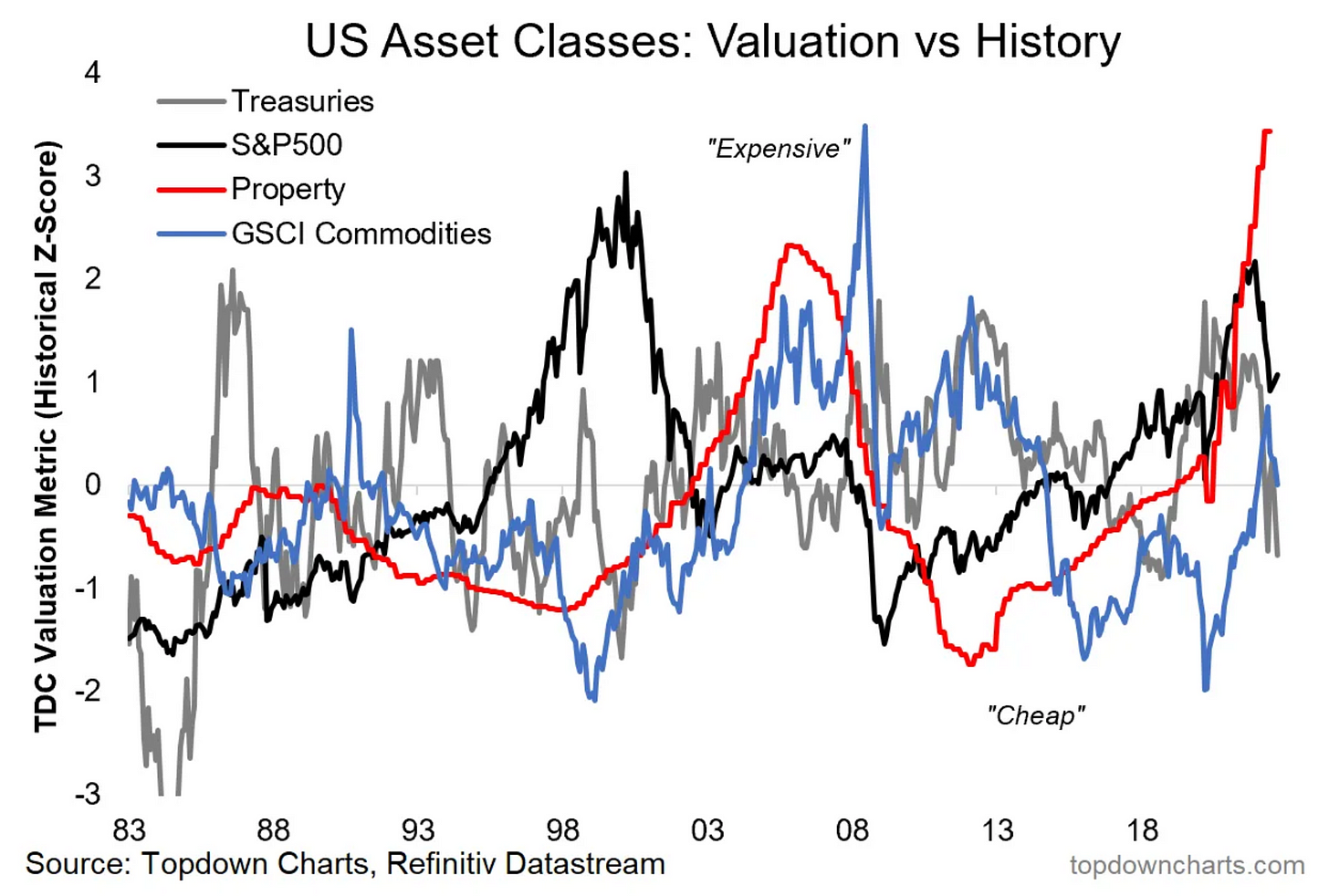 In absolute terms, US equity valuations are still elevated vs history; expensive. If it’s any consolation, property is wildly more expensive — most extreme reading on record(!). Commodities meanwhile are about neutral, and bonds by now are starting to look cheap.