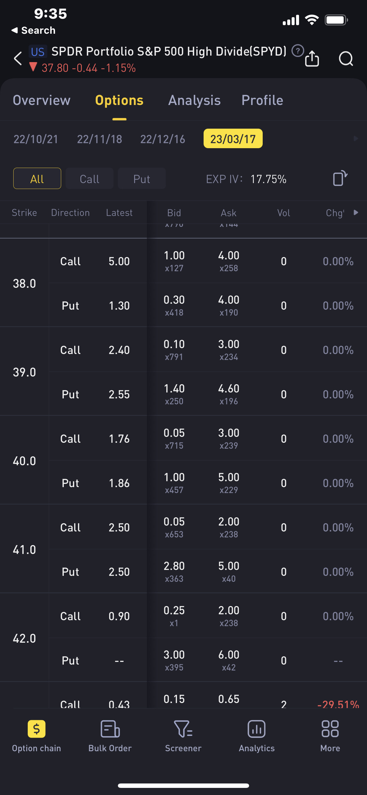 Say now $SPDR Portfolio S&P 500 High Dividend ETF(SPYD)$is around 37 sell the call at 38 for 6 months and get a $5 call option and then only need to pay $32 for the 100 shares which is 17% return