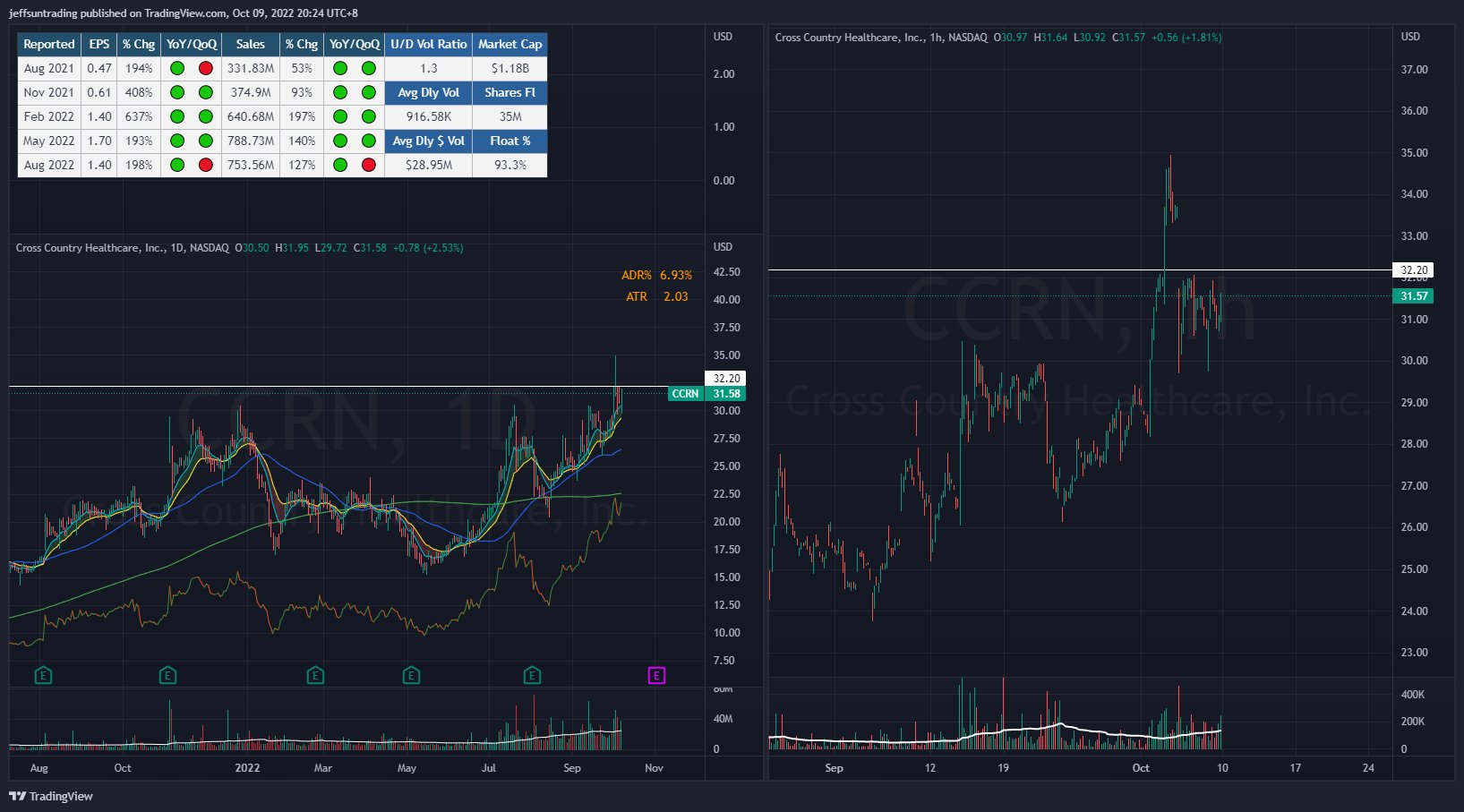 Here are the hot stocks that I think are important today, and I want to show them in chart form:$Cross Country Healthcare(CCRN)$ $Sweetgreen, Inc.(SG)$ $Rhythm Pharmaceuticals Inc.(RYTM)$ $GS Acquisition Holdings Corp(MIR)$  https://twitter.com/jeffsuntrading/status/1579086366545043463
