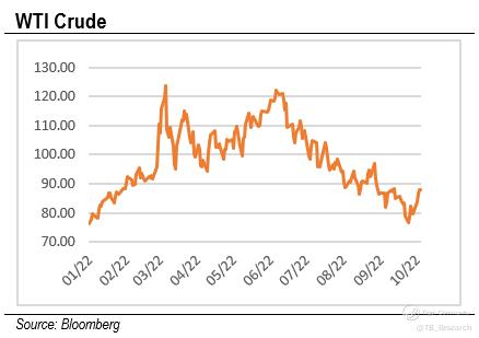Oil stocks were cheered on by the OPEC+ agreement to cut production by 2 million barrels a day starting from November despite tight global supplies. The actual net-impact would likely be less given that OPEC members have not been able to meet productions against their quotas. WTI crude recovered sharply back to the $88-per-barrel level over the month, bucking fears that macroeconomic slowdown would dent demand.