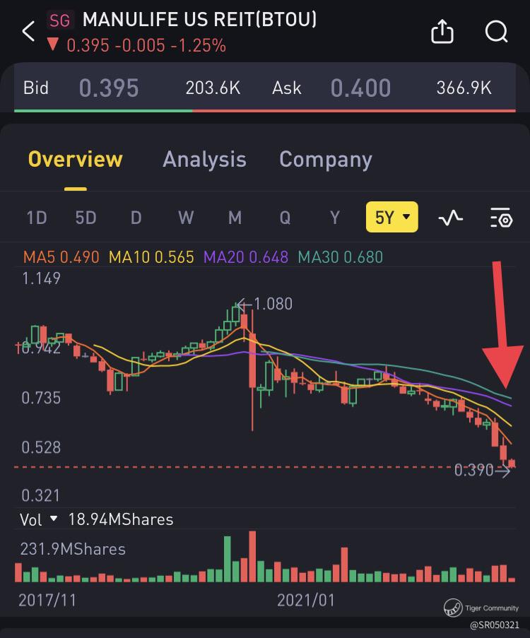 $MANULIFE US REIT(BTOU.SI)$recently bought at USD 0.43 Now creating another low in the last 5 yr [Surprised]