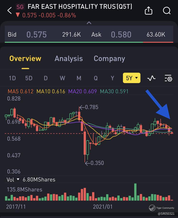 Today i see $FAR EAST HOSPITALITY TRUST(Q5T.SI)$ 52wk low 0.52, DY5.34%, PB 0.67, div 0.03 EPS 0.07 (quite ok), grearing ratio (debt) the last 5 yrs below 40%. I will consider it if dip more nearer to 52wk low, why ? Because my other stocks nearer to 5yrs low now [Facepalm] so it's all look interesting but which one to add first ?