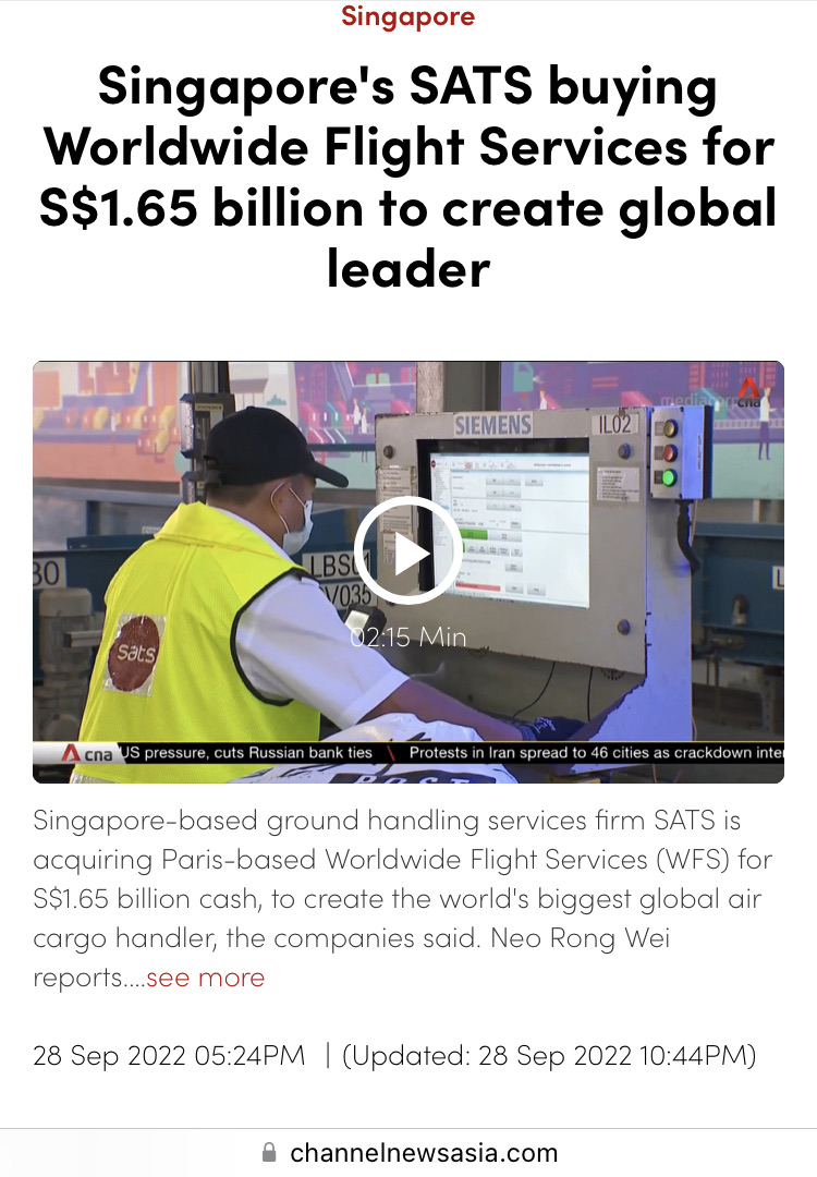 "This is a transformational opportunity for SATS and our proposed acquisition of WFS will create a global leader," Kerry Mok, SATS' CEO, said in a statement on Wednesday (Sep 28).