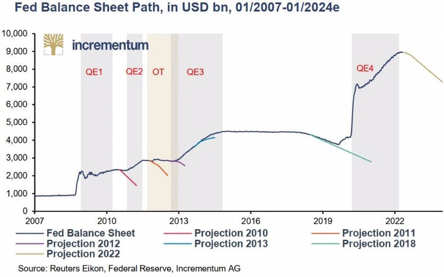 However, on the other hand, the world's major central banks are trying to deal with the inflation crisis by raising interest rates, and to put it mildly, I think they are actually digging a hole for themselves, but it is a hole they designed in the past. In the current situation of increasing interest rates, their debts will become more difficult to repay! And speaking of tapering, the world's major central banks are now trying to normalize their previously huge balance sheets! They have previously promised that the trillions of dollars of quantitative easing implemented in the 21st century is only temporary and that they will sell these assets in the future. However, every time they try to do QT, they have a reason to change their minds. Let me give you an example. It's not easy for someone who has been a drug addict for a long time to suddenly get clean and sober, is it?