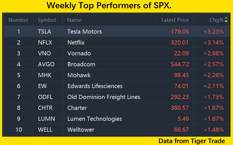 The top 10 winners of$S&P 500(.SPX)$ are $Tesla Motors(TSLA)$ , $Netflix(NFLX)$ ,$Vornado(VNO)$ ,$Broadcom(AVGO)$ ,$Mohawk(MHK)$ ,$Edwards Lifesciences(EW)$ ,$Old Dominion Freight Lines(ODFL)$ ,$Charter(CHTR)$ ,$Lumen Technologies(LUMN)$ ,$Welltower(WELL)$