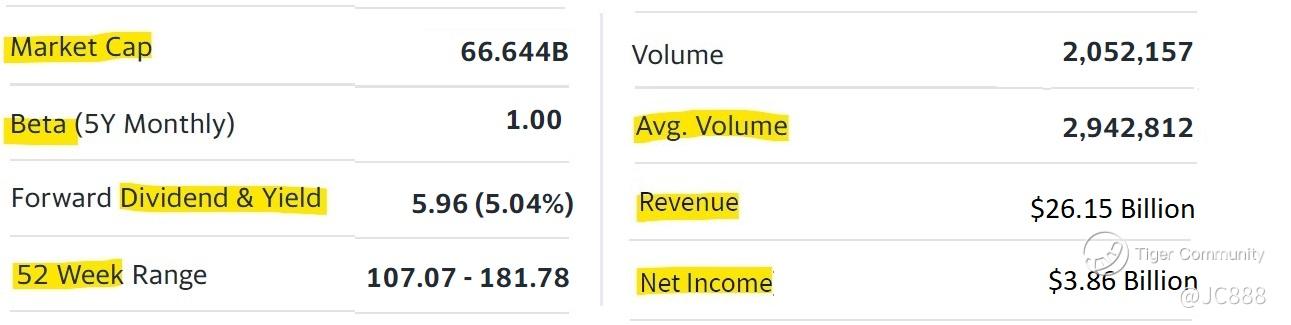 - Nice dividend at $5.96 per share. Based on current stock price ($120.57); this works out to be about 4.94% returns. Decent dividend. Better than investing in APPL or TSLA - that is losing money big time.