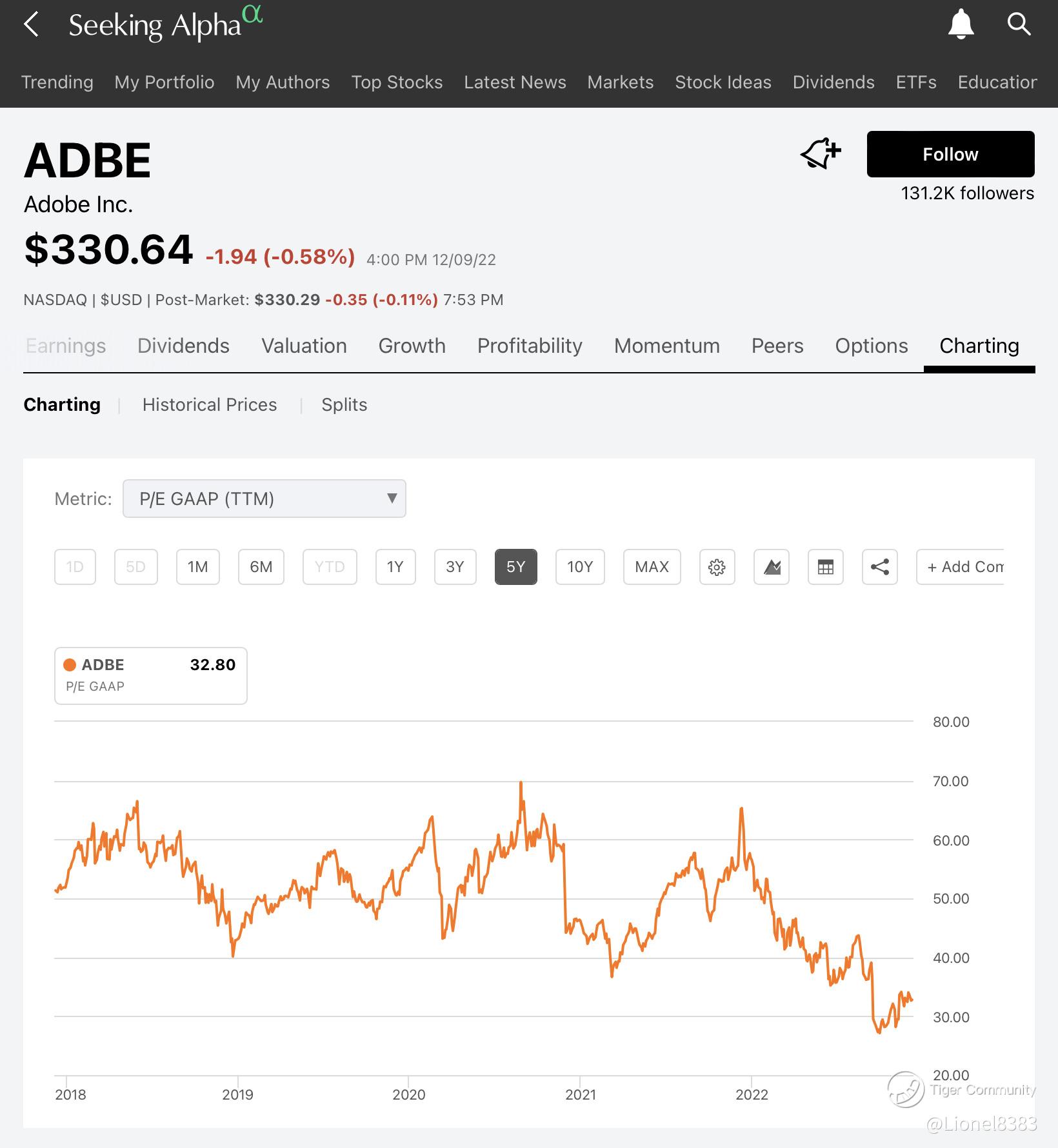 Adobe Price to Earnings (TTM) 5-years