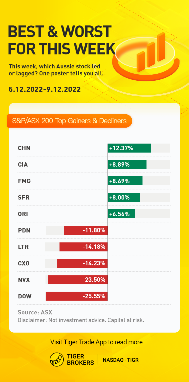 During the last 5 trading days, $Chalice Gold Mines(CHN.AU)$ $Champion Iron Ltd(CIA.AU)$ $FORTESCUE METALS GROUP LTD(FMG.AU)$ $Sandfire Resources NL(SFR.AU)$ $ORICA LIMITED(ORI.AU)$ are the top 5 Weekly gainers, up 12.37%, 8.89%, 8.69%, 8.00%, and 6.56% respectively.