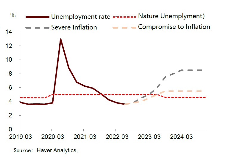 In either case, the unemployment will rise above 5% at the end of 2023.