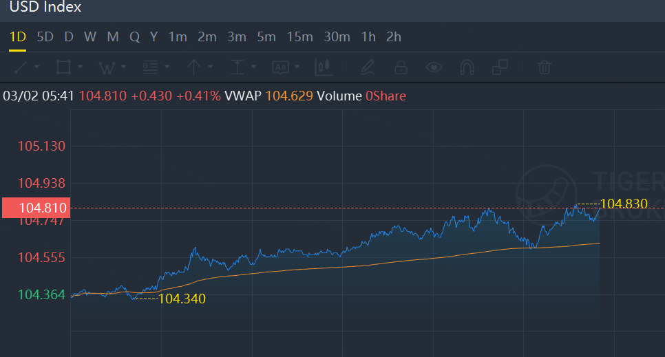 2) $USD Index(USDindex.FOREX)$ rise 0.41% to $104.83, The trend of the dollar and the trend of the index are still negatively correlated.