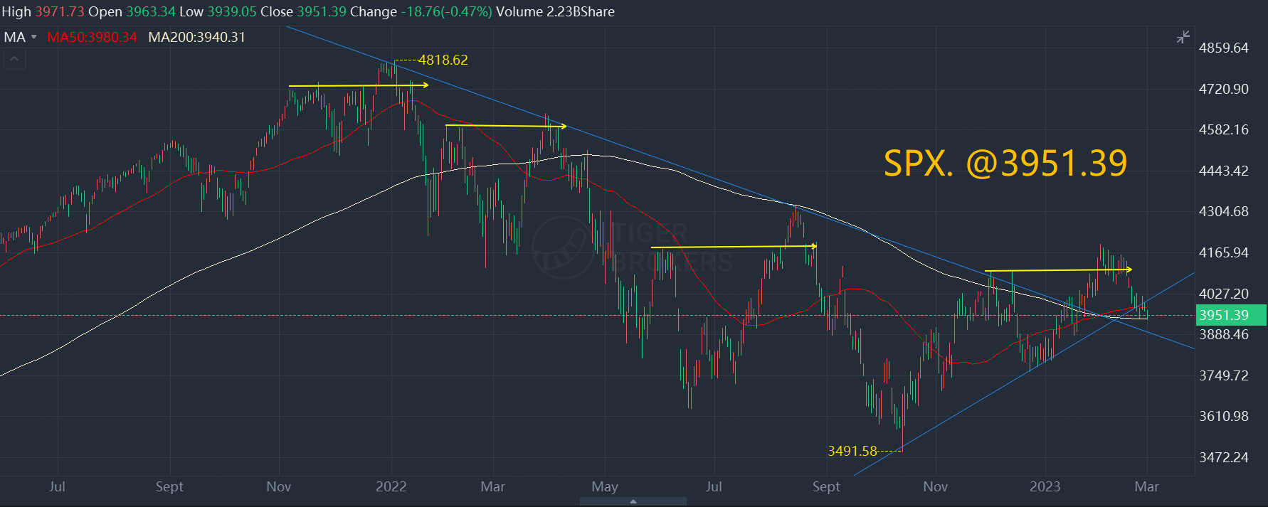 $S&P 500(.SPX)$ trading at a critically important level here. Right below the 50 Day Moving Average(MA50 Redline) but right above the 200 Day Moving Average(MA200 whiteline).