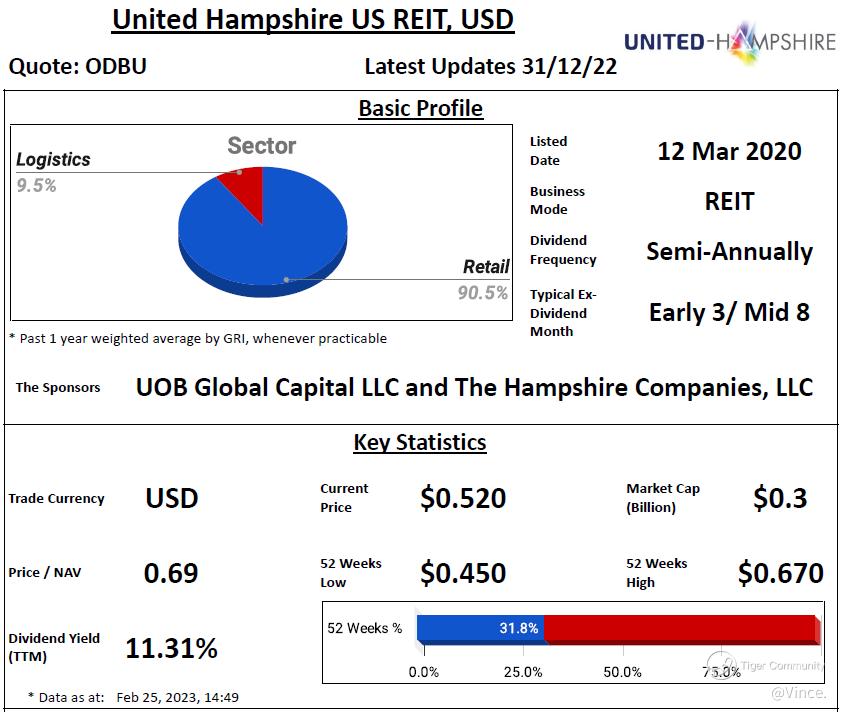 Performance has improved as compared to the previous quarter due to the full quarter contribution from Upland Square. With the loan refinancing, there will be no debt maturity in 2023, and coupled with an 81.4% fixed rate, the risk of increasing finance costs is mitigated. Going forward, UHREIT is expected to benefit from improving grocery and retail sales and strong consumer spending.