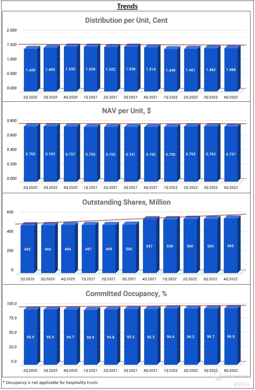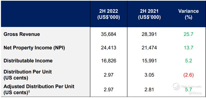 Gross revenue, NPI and distributable income increased yoy mainly due to contributions from Colonial Square, Penrose Plaza and Upland Square which were acquired between Nov 2021 to Jul 2022. DPU on the other hand declined slightly due to the absence of income support. Excluding the income support in 2H FY21, DPU improved by 5.7% yoy.