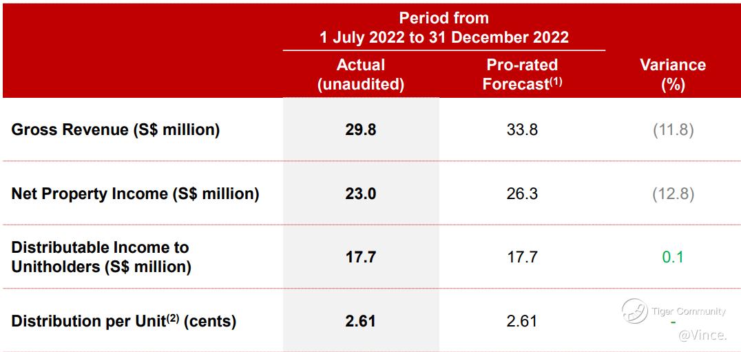 Gross revenue and NPI are lower than IPO forecast due to the impact of weaker JPY/SGD forex. However, distributable income and DPU are able to meet the forecast mainly due to lower finance expenses, trust expenses and realized exchange gain.