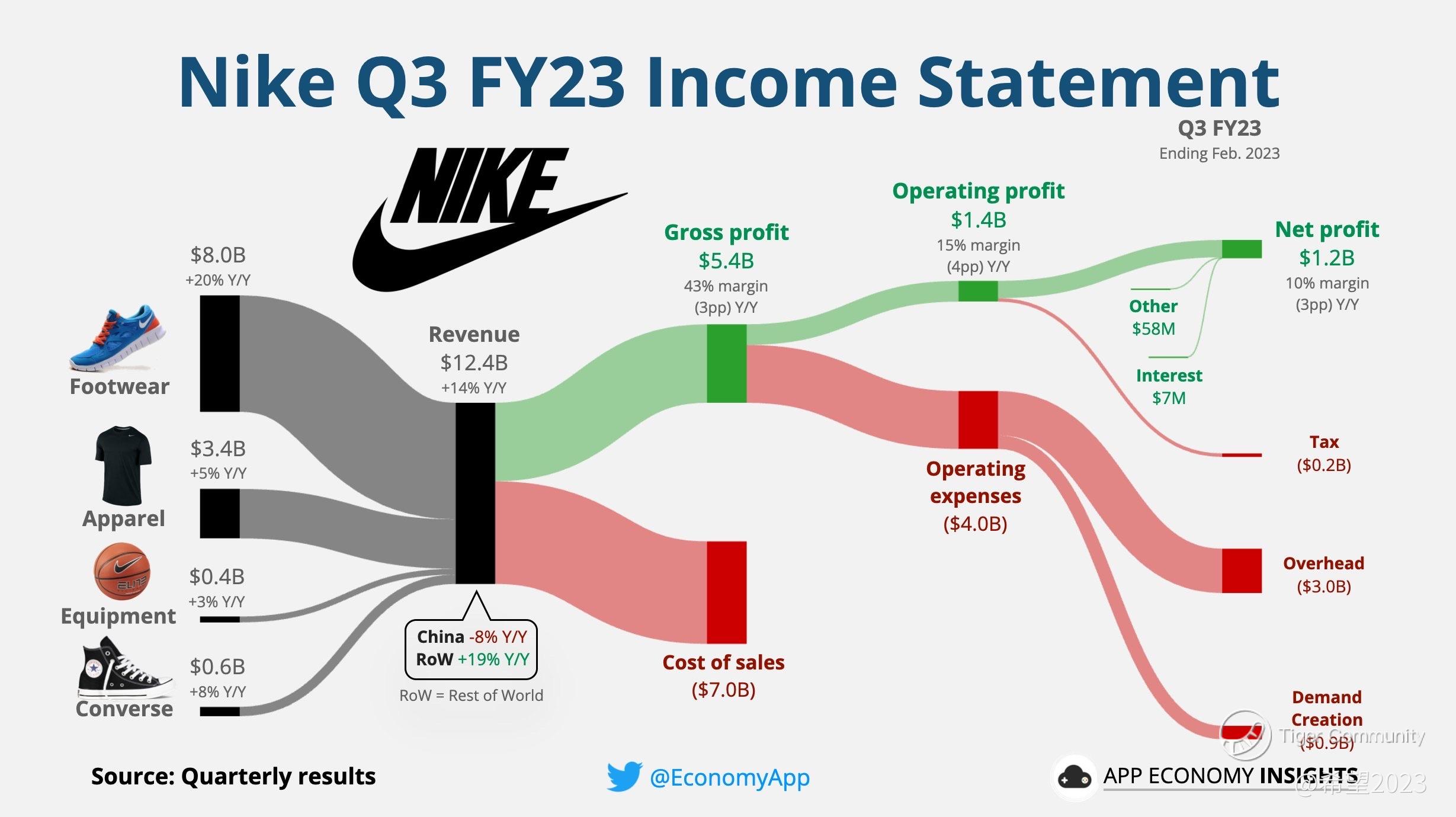 Nike has announced its Q3 earnings for the 2023 fiscal year. The report shows that Nike's revenue for Q3 grew 14% year-over-year to $12.39 billion, exceeding market expectations of $11.47 billion. However, net profit fell by 11% to $1.24 billion, while diluted earnings per share were $0.79, beating the market's expected $0.55 but lower than the previous year's $0.87.