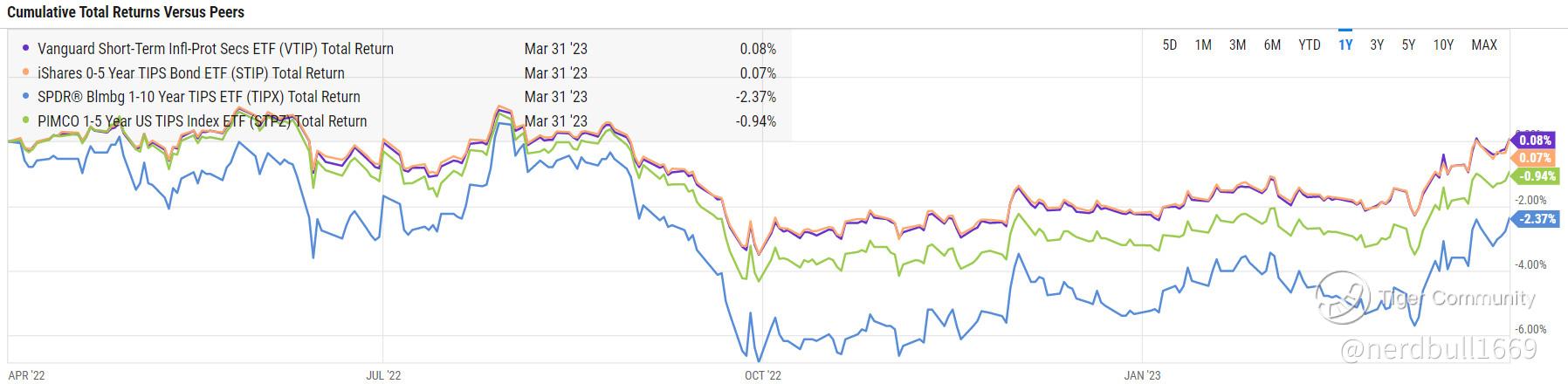 VTIP has performed well compared to its peers, similar ETF fund. Data shown is as of 31 Mar 2023.